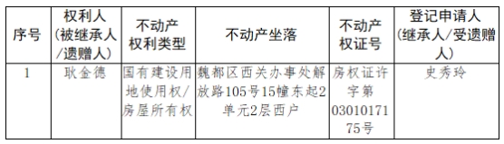 根据《不动产登记暂行条例实施细则》第十四条的规定,经初步查验,不动产登记机构拟对下列不动产权利办理不动产继承登记。根据《不动产登记暂行条例实施细则》第十七条的规定,现予公告。如有异议,请自本公告之日起15个工作日内,将异议书面材料送达不动产登记机构。逾期无人提出异议或者异议不成立的,不动产登记机构将予以登记。