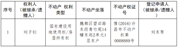 根据《不动产登记暂行条例实施细则》第十四条的规定,经初步查验,不动产登记机构拟对下列不动产权利办理不动产继承登记。根据《不动产登记暂行条例实施细则》第十七条的规定,现予公告。如有异议,请自本公告之日起15个工作日内,将异议书面材料送达不动产登记机构。逾期无人提出异议或者异议不成立的,不动产登记机构将予以登记。