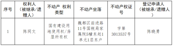 根据《不动产登记暂行条例实施细则》第十四条的规定,经初步查验,不动产登记机构拟对下列不动产权利办理不动产继承登记。根据《不动产登记暂行条例实施细则》第十七条的规定,现予公告。如有异议,请自本公告之日起15个工作日内,将异议书面材料送达不动产登记机构。逾期无人提出异议或者异议不成立的,不动产登记机构将予以登记。