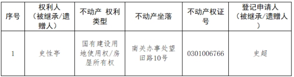 根据《不动产登记暂行条例实施细则》第十四条的规定,经初步查验,不动产登记机构拟对下列不动产权利办理不动产继承登记。根据《不动产登记暂行条例实施细则》第十七条的规定,现予公告。如有异议,请自本公告之日起15个工作日内,将异议书面材料送达不动产登记机构。逾期无人提出异议或者异议不成立的,不动产登记机构将予以登记。