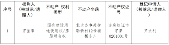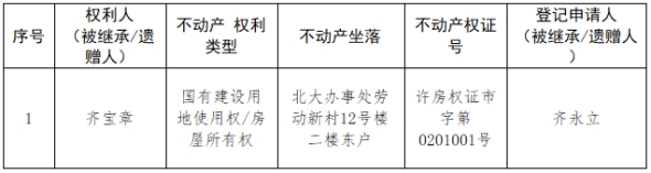 根据《不动产登记暂行条例实施细则》第十四条的规定,经初步查验,不动产登记机构拟对下列不动产权利办理不动产继承登记。根据《不动产登记暂行条例实施细则》第十七条的规定,现予公告。如有异议,请自本公告之日起15个工作日内,将异议书面材料送达不动产登记机构。逾期无人提出异议或者异议不成立的,不动产登记机构将予以登记。
