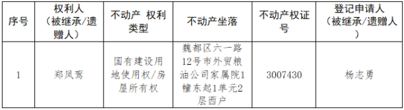 根据《不动产登记暂行条例实施细则》第十四条的规定,经初步查验,不动产登记机构拟对下列不动产权利办理不动产继承登记。根据《不动产登记暂行条例实施细则》第十七条的规定,现予公告。如有异议,请自本公告之日起15个工作日内,将异议书面材料送达不动产登记机构。逾期无人提出异议或者异议不成立的,不动产登记机构将予以登记。