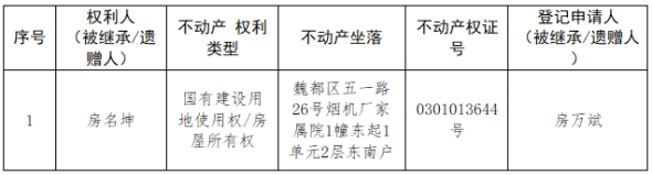 根据《不动产登记暂行条例实施细则》第十四条的规定,经初步查验,不动产登记机构拟对下列不动产权利办理不动产继承登记。根据《不动产登记暂行条例实施细则》第十七条的规定,现予公告。如有异议,请自本公告之日起15个工作日内,将异议书面材料送达不动产登记机构。逾期无人提出异议或者异议不成立的,不动产登记机构将予以登记。