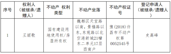 根据《不动产登记暂行条例实施细则》第十四条的规定,经初步查验,不动产登记机构拟对下列不动产权利办理不动产继承登记。根据《不动产登记暂行条例实施细则》第十七条的规定,现予公告。如有异议,请自本公告之日起15个工作日内,将异议书面材料送达不动产登记机构。逾期无人提出异议或者异议不成立的,不动产登记机构将予以登记。
