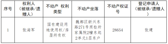 根据《不动产登记暂行条例实施细则》第十四条的规定,经初步查验,不动产登记机构拟对下列不动产权利办理不动产继承登记。根据《不动产登记暂行条例实施细则》第十七条的规定,现予公告。如有异议,请自本公告之日起15个工作日内,将异议书面材料送达不动产登记机构。逾期无人提出异议或者异议不成立的,不动产登记机构将予以登记。
