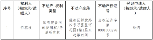 根据《不动产登记暂行条例实施细则》第十四条的规定,经初步查验,不动产登记机构拟对下列不动产权利办理不动产继承登记。根据《不动产登记暂行条例实施细则》第十七条的规定,现予公告。如有异议,请自本公告之日起15个工作日内,将异议书面材料送达不动产登记机构。逾期无人提出异议或者异议不成立的,不动产登记机构将予以登记。