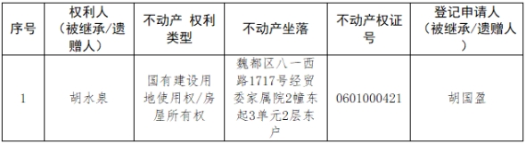 根据《不动产登记暂行条例实施细则》第十四条的规定,经初步查验,不动产登记机构拟对下列不动产权利办理不动产继承登记。根据《不动产登记暂行条例实施细则》第十七条的规定,现予公告。如有异议,请自本公告之日起15个工作日内,将异议书面材料送达不动产登记机构。逾期无人提出异议或者异议不成立的,不动产登记机构将予以登记。
