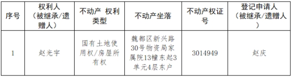 根据《不动产登记暂行条例实施细则》第十四条的规定,经初步查验,不动产登记机构拟对下列不动产权利办理不动产继承登记。根据《不动产登记暂行条例实施细则》第十七条的规定,现予公告。如有异议,请自本公告之日起15个工作日内,将异议书面材料送达不动产登记机构。逾期无人提出异议或者异议不成立的,不动产登记机构将予以登记。