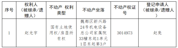 根据《不动产登记暂行条例实施细则》第十四条的规定,经初步查验,不动产登记机构拟对下列不动产权利办理不动产继承登记。根据《不动产登记暂行条例实施细则》第十七条的规定,现予公告。如有异议,请自本公告之日起15个工作日内,将异议书面材料送达不动产登记机构。逾期无人提出异议或者异议不成立的,不动产登记机构将予以登记。