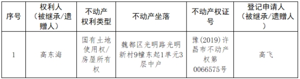 根据《不动产登记暂行条例实施细则》第十四条的规定,经初步查验,不动产登记机构拟对下列不动产权利办理不动产继承登记。根据《不动产登记暂行条例实施细则》第十七条的规定,现予公告。如有异议,请自本公告之日起15个工作日内,将异议书面材料送达不动产登记机构。逾期无人提出异议或者异议不成立的,不动产登记机构将予以登记。