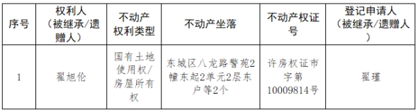根据《不动产登记暂行条例实施细则》第十四条的规定,经初步查验,不动产登记机构拟对下列不动产权利办理不动产继承登记。根据《不动产登记暂行条例实施细则》第十七条的规定,现予公告。如有异议,请自本公告之日起15个工作日内,将异议书面材料送达不动产登记机构。逾期无人提出异议或者异议不成立的,不动产登记机构将予以登记。