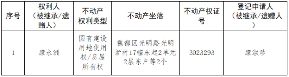 根据《不动产登记暂行条例实施细则》第十四条的规定,经初步查验,不动产登记机构拟对下列不动产权利办理不动产继承登记。根据《不动产登记暂行条例实施细则》第十七条的规定,现予公告。如有异议,请自本公告之日起15个工作日内,将异议书面材料送达不动产登记机构。逾期无人提出异议或者异议不成立的,不动产登记机构将予以登记。