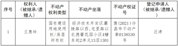 根据《不动产登记暂行条例实施细则》第十四条的规定,经初步查验,不动产登记机构拟对下列不动产权利办理不动产继承登记。根据《不动产登记暂行条例实施细则》第十七条的规定,现予公告。如有异议,请自本公告之日起15个工作日内,将异议书面材料送达不动产登记机构。逾期无人提出异议或者异议不成立的,不动产登记机构将予以登记。