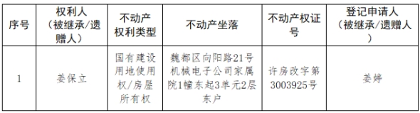 根据《不动产登记暂行条例实施细则》第十四条的规定,经初步查验,不动产登记机构拟对下列不动产权利办理不动产继承登记。根据《不动产登记暂行条例实施细则》第十七条的规定,现予公告。如有异议,请自本公告之日起15个工作日内,将异议书面材料送达不动产登记机构。逾期无人提出异议或者异议不成立的,不动产登记机构将予以登记。