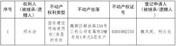 根据《不动产登记暂行条例实施细则》第十四条的规定,经初步查验,不动产登记机构拟对下列不动产权利办理不动产继承登记。根据《不动产登记暂行条例实施细则》第十七条的规定,现予公告。如有异议,请自本公告之日起15个工作日内,将异议书面材料送达不动产登记机构。逾期无人提出异议或者异议不成立的,不动产登记机构将予以登记。