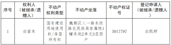 根据《不动产登记暂行条例实施细则》第十四条的规定,经初步查验,不动产登记机构拟对下列不动产权利办理不动产继承登记。根据《不动产登记暂行条例实施细则》第十七条的规定,现予公告。如有异议,请自本公告之日起15个工作日内,将异议书面材料送达不动产登记机构。逾期无人提出异议或者异议不成立的,不动产登记机构将予以登记。