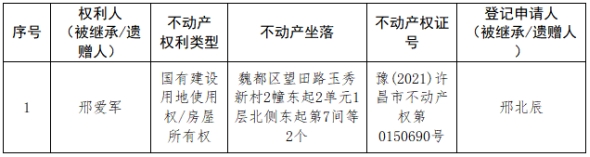 根据《不动产登记暂行条例实施细则》第十四条的规定,经初步查验,不动产登记机构拟对下列不动产权利办理不动产继承登记。根据《不动产登记暂行条例实施细则》第十七条的规定,现予公告。如有异议,请自本公告之日起15个工作日内,将异议书面材料送达不动产登记机构。逾期无人提出异议或者异议不成立的,不动产登记机构将予以登记。