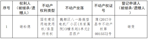 根据《不动产登记暂行条例实施细则》第十四条的规定,经初步查验,不动产登记机构拟对下列不动产权利办理不动产继承登记。根据《不动产登记暂行条例实施细则》第十七条的规定,现予公告。如有异议,请自本公告之日起15个工作日内,将异议书面材料送达不动产登记机构。逾期无人提出异议或者异议不成立的,不动产登记机构将予以登记。