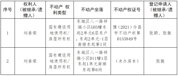 根据《不动产登记暂行条例实施细则》第十四条的规定,经初步查验,不动产登记机构拟对下列不动产权利办理不动产继承登记。根据《不动产登记暂行条例实施细则》第十七条的规定,现予公告。如有异议,请自本公告之日起15个工作日内,将异议书面材料送达不动产登记机构。逾期无人提出异议或者异议不成立的,不动产登记机构将予以登记。