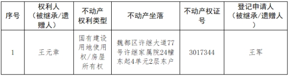 根据《不动产登记暂行条例实施细则》第十四条的规定,经初步查验,不动产登记机构拟对下列不动产权利办理不动产继承登记。根据《不动产登记暂行条例实施细则》第十七条的规定,现予公告。如有异议,请自本公告之日起15个工作日内,将异议书面材料送达不动产登记机构。逾期无人提出异议或者异议不成立的,不动产登记机构将予以登记。