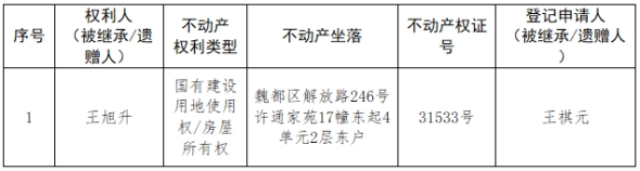 根据《不动产登记暂行条例实施细则》第十四条的规定,经初步查验,不动产登记机构拟对下列不动产权利办理不动产继承登记。根据《不动产登记暂行条例实施细则》第十七条的规定,现予公告。如有异议,请自本公告之日起15个工作日内,将异议书面材料送达不动产登记机构。逾期无人提出异议或者异议不成立的,不动产登记机构将予以登记。