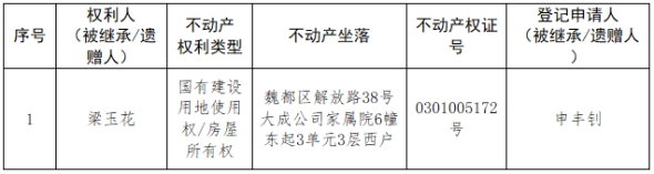 根据《不动产登记暂行条例实施细则》第十四条的规定,经初步查验,不动产登记机构拟对下列不动产权利办理不动产继承登记。根据《不动产登记暂行条例实施细则》第十七条的规定,现予公告。如有异议,请自本公告之日起15个工作日内,将异议书面材料送达不动产登记机构。逾期无人提出异议或者异议不成立的,不动产登记机构将予以登记。