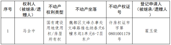 根据《不动产登记暂行条例实施细则》第十四条的规定,经初步查验,不动产登记机构拟对下列不动产权利办理不动产继承登记。根据《不动产登记暂行条例实施细则》第十七条的规定,现予公告。如有异议,请自本公告之日起15个工作日内,将异议书面材料送达不动产登记机构。逾期无人提出异议或者异议不成立的,不动产登记机构将予以登记。