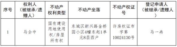 根据《不动产登记暂行条例实施细则》第十四条的规定,经初步查验,不动产登记机构拟对下列不动产权利办理不动产继承登记。根据《不动产登记暂行条例实施细则》第十七条的规定,现予公告。如有异议,请自本公告之日起15个工作日内,将异议书面材料送达不动产登记机构。逾期无人提出异议或者异议不成立的,不动产登记机构将予以登记。