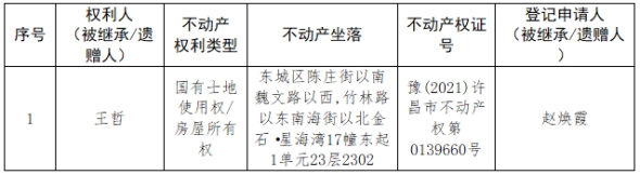 根据《不动产登记暂行条例实施细则》第十四条的规定,经初步查验,不动产登记机构拟对下列不动产权利办理不动产继承登记。根据《不动产登记暂行条例实施细则》第十七条的规定,现予公告。如有异议,请自本公告之日起15个工作日内,将异议书面材料送达不动产登记机构。逾期无人提出异议或者异议不成立的,不动产登记机构将予以登记。