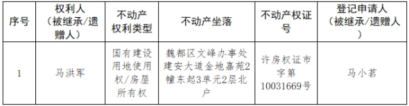 根据《不动产登记暂行条例实施细则》第十四条的规定,经初步查验,不动产登记机构拟对下列不动产权利办理不动产继承登记。根据《不动产登记暂行条例实施细则》第十七条的规定,现予公告。如有异议,请自本公告之日起15个工作日内,将异议书面材料送达不动产登记机构。逾期无人提出异议或者异议不成立的,不动产登记机构将予以登记。