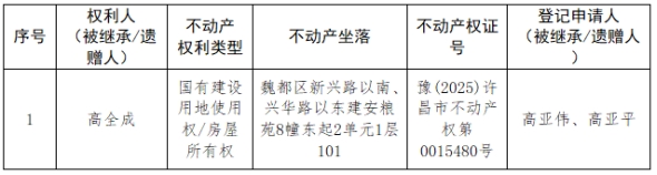 根据《不动产登记暂行条例实施细则》第十四条的规定,经初步查验,不动产登记机构拟对下列不动产权利办理不动产继承登记。根据《不动产登记暂行条例实施细则》第十七条的规定,现予公告。如有异议,请自本公告之日起15个工作日内,将异议书面材料送达不动产登记机构。逾期无人提出异议或者异议不成立的,不动产登记机构将予以登记。