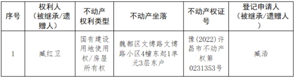 根据《不动产登记暂行条例实施细则》第十四条的规定,经初步查验,不动产登记机构拟对下列不动产权利办理不动产继承登记。根据《不动产登记暂行条例实施细则》第十七条的规定,现予公告。如有异议,请自本公告之日起15个工作日内,将异议书面材料送达不动产登记机构。逾期无人提出异议或者异议不成立的,不动产登记机构将予以登记。