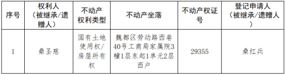 根据《不动产登记暂行条例实施细则》第十四条的规定,经初步查验,不动产登记机构拟对下列不动产权利办理不动产继承登记。根据《不动产登记暂行条例实施细则》第十七条的规定,现予公告。如有异议,请自本公告之日起15个工作日内,将异议书面材料送达不动产登记机构。逾期无人提出异议或者异议不成立的,不动产登记机构将予以登记。