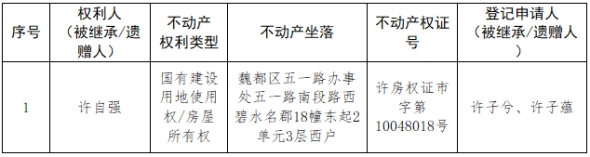 根据《不动产登记暂行条例实施细则》第十四条的规定,经初步查验,不动产登记机构拟对下列不动产权利办理不动产继承登记。根据《不动产登记暂行条例实施细则》第十七条的规定,现予公告。如有异议,请自本公告之日起15个工作日内,将异议书面材料送达不动产登记机构。逾期无人提出异议或者异议不成立的,不动产登记机构将予以登记。