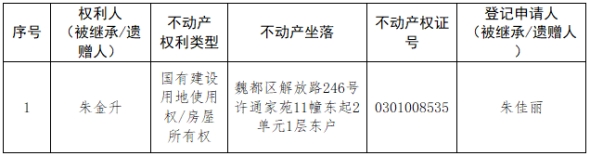 根据《不动产登记暂行条例实施细则》第十四条的规定,经初步查验,不动产登记机构拟对下列不动产权利办理不动产继承登记。根据《不动产登记暂行条例实施细则》第十七条的规定,现予公告。如有异议,请自本公告之日起15个工作日内,将异议书面材料送达不动产登记机构。逾期无人提出异议或者异议不成立的,不动产登记机构将予以登记。
