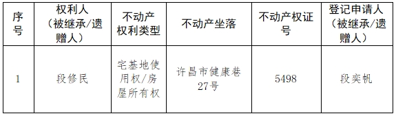 根据《不动产登记暂行条例实施细则》第十四条的规定,经初步查验,不动产登记机构拟对下列不动产权利办理不动产继承登记。根据《不动产登记暂行条例实施细则》第十七条的规定,现予公告。如有异议,请自本公告之日起15个工作日内,将异议书面材料送达不动产登记机构。逾期无人提出异议或者异议不成立的,不动产登记机构将予以登记。