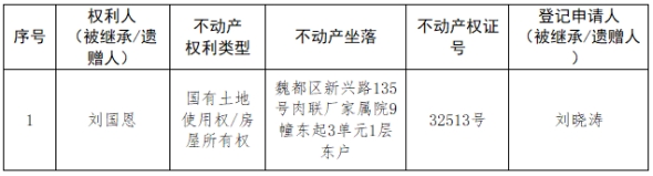 根据《不动产登记暂行条例实施细则》第十四条的规定,经初步查验,不动产登记机构拟对下列不动产权利办理不动产继承登记。根据《不动产登记暂行条例实施细则》第十七条的规定,现予公告。如有异议,请自本公告之日起15个工作日内,将异议书面材料送达不动产登记机构。逾期无人提出异议或者异议不成立的,不动产登记机构将予以登记。
