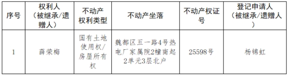 根据《不动产登记暂行条例实施细则》第十四条的规定,经初步查验,不动产登记机构拟对下列不动产权利办理不动产继承登记。根据《不动产登记暂行条例实施细则》第十七条的规定,现予公告。如有异议,请自本公告之日起15个工作日内,将异议书面材料送达不动产登记机构。逾期无人提出异议或者异议不成立的,不动产登记机构将予以登记。