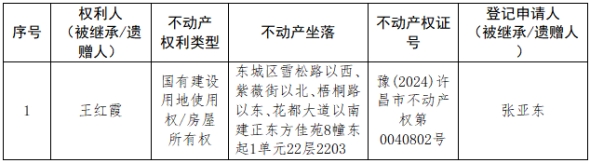 根据《不动产登记暂行条例实施细则》第十四条的规定,经初步查验,不动产登记机构拟对下列不动产权利办理不动产继承登记。根据《不动产登记暂行条例实施细则》第十七条的规定,现予公告。如有异议,请自本公告之日起15个工作日内,将异议书面材料送达不动产登记机构。逾期无人提出异议或者异议不成立的,不动产登记机构将予以登记。