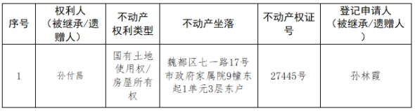 根据《不动产登记暂行条例实施细则》第十四条的规定,经初步查验,不动产登记机构拟对下列不动产权利办理不动产继承登记。根据《不动产登记暂行条例实施细则》第十七条的规定,现予公告。如有异议,请自本公告之日起15个工作日内,将异议书面材料送达不动产登记机构。逾期无人提出异议或者异议不成立的,不动产登记机构将予以登记。