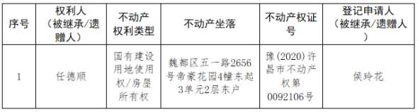 根据《不动产登记暂行条例实施细则》第十四条的规定,经初步查验,不动产登记机构拟对下列不动产权利办理不动产继承登记。根据《不动产登记暂行条例实施细则》第十七条的规定,现予公告。如有异议,请自本公告之日起15个工作日内,将异议书面材料送达不动产登记机构。逾期无人提出异议或者异议不成立的,不动产登记机构将予以登记。