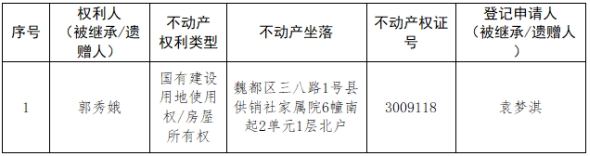 根据《不动产登记暂行条例实施细则》第十四条的规定,经初步查验,不动产登记机构拟对下列不动产权利办理不动产继承登记。根据《不动产登记暂行条例实施细则》第十七条的规定,现予公告。如有异议,请自本公告之日起15个工作日内,将异议书面材料送达不动产登记机构。逾期无人提出异议或者异议不成立的,不动产登记机构将予以登记。