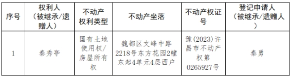根据《不动产登记暂行条例实施细则》第十四条的规定,经初步查验,不动产登记机构拟对下列不动产权利办理不动产继承登记。根据《不动产登记暂行条例实施细则》第十七条的规定,现予公告。如有异议,请自本公告之日起15个工作日内,将异议书面材料送达不动产登记机构。逾期无人提出异议或者异议不成立的,不动产登记机构将予以登记。