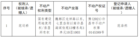 根据《不动产登记暂行条例实施细则》第十四条的规定,经初步查验,不动产登记机构拟对下列不动产权利办理不动产继承登记。根据《不动产登记暂行条例实施细则》第十七条的规定,现予公告。如有异议,请自本公告之日起15个工作日内,将异议书面材料送达不动产登记机构。逾期无人提出异议或者异议不成立的,不动产登记机构将予以登记。