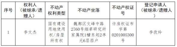 根据《不动产登记暂行条例实施细则》第十四条的规定,经初步查验,不动产登记机构拟对下列不动产权利办理不动产继承登记。根据《不动产登记暂行条例实施细则》第十七条的规定,现予公告。如有异议,请自本公告之日起15个工作日内,将异议书面材料送达不动产登记机构。逾期无人提出异议或者异议不成立的,不动产登记机构将予以登记。