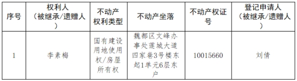 根据《不动产登记暂行条例实施细则》第十四条的规定,经初步查验,不动产登记机构拟对下列不动产权利办理不动产继承登记。根据《不动产登记暂行条例实施细则》第十七条的规定,现予公告。如有异议,请自本公告之日起15个工作日内,将异议书面材料送达不动产登记机构。逾期无人提出异议或者异议不成立的,不动产登记机构将予以登记。