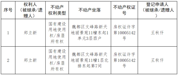 根据《不动产登记暂行条例实施细则》第十四条的规定,经初步查验,不动产登记机构拟对下列不动产权利办理不动产继承登记。根据《不动产登记暂行条例实施细则》第十七条的规定,现予公告。如有异议,请自本公告之日起15个工作日内,将异议书面材料送达不动产登记机构。逾期无人提出异议或者异议不成立的,不动产登记机构将予以登记。