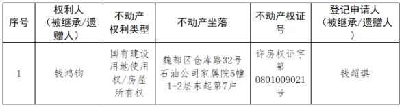 根据《不动产登记暂行条例实施细则》第十四条的规定,经初步查验,不动产登记机构拟对下列不动产权利办理不动产继承登记。根据《不动产登记暂行条例实施细则》第十七条的规定,现予公告。如有异议,请自本公告之日起15个工作日内,将异议书面材料送达不动产登记机构。逾期无人提出异议或者异议不成立的,不动产登记机构将予以登记。