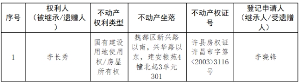 根据《不动产登记暂行条例实施细则》第十四条的规定,经初步查验,不动产登记机构拟对下列不动产权利办理不动产继承登记。根据《不动产登记暂行条例实施细则》第十七条的规定,现予公告。如有异议,请自本公告之日起15个工作日内,将异议书面材料送达不动产登记机构。逾期无人提出异议或者异议不成立的,不动产登记机构将予以登记。