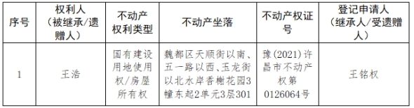 根据《不动产登记暂行条例实施细则》第十四条的规定,经初步查验,不动产登记机构拟对下列不动产权利办理不动产继承登记。根据《不动产登记暂行条例实施细则》第十七条的规定,现予公告。如有异议,请自本公告之日起15个工作日内,将异议书面材料送达不动产登记机构。逾期无人提出异议或者异议不成立的,不动产登记机构将予以登记。
